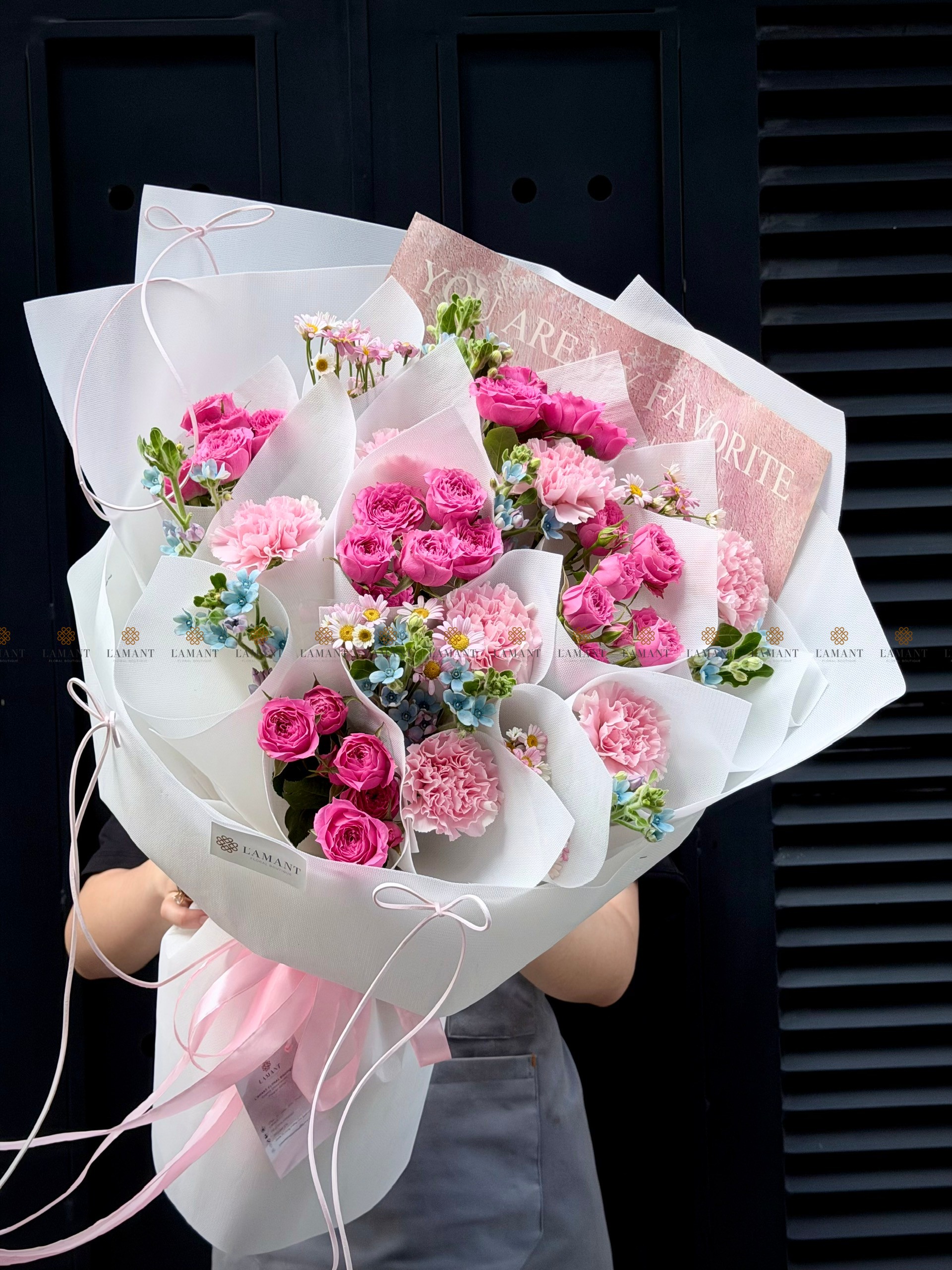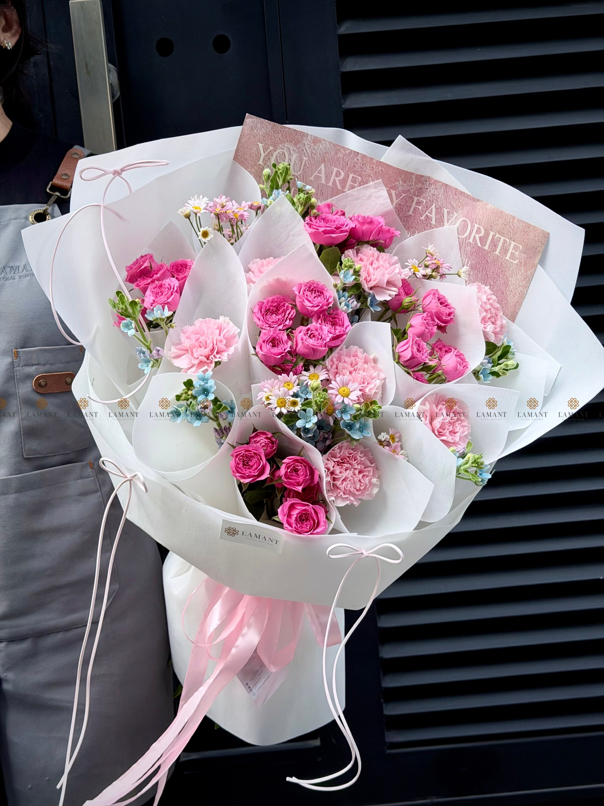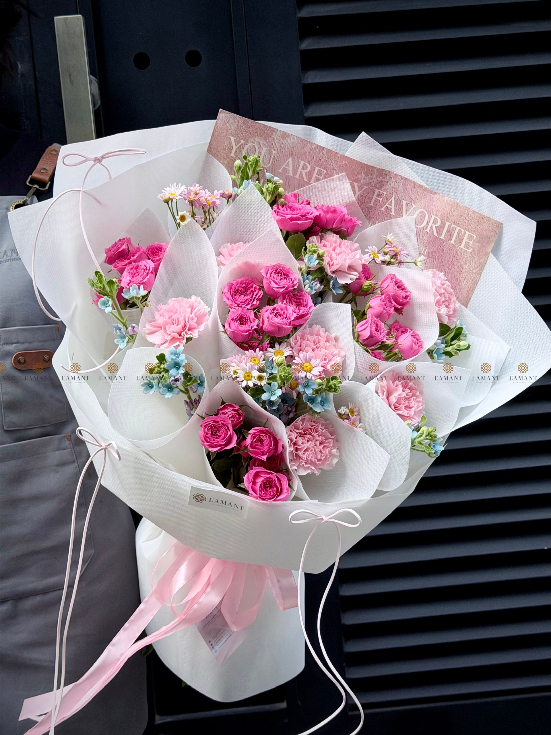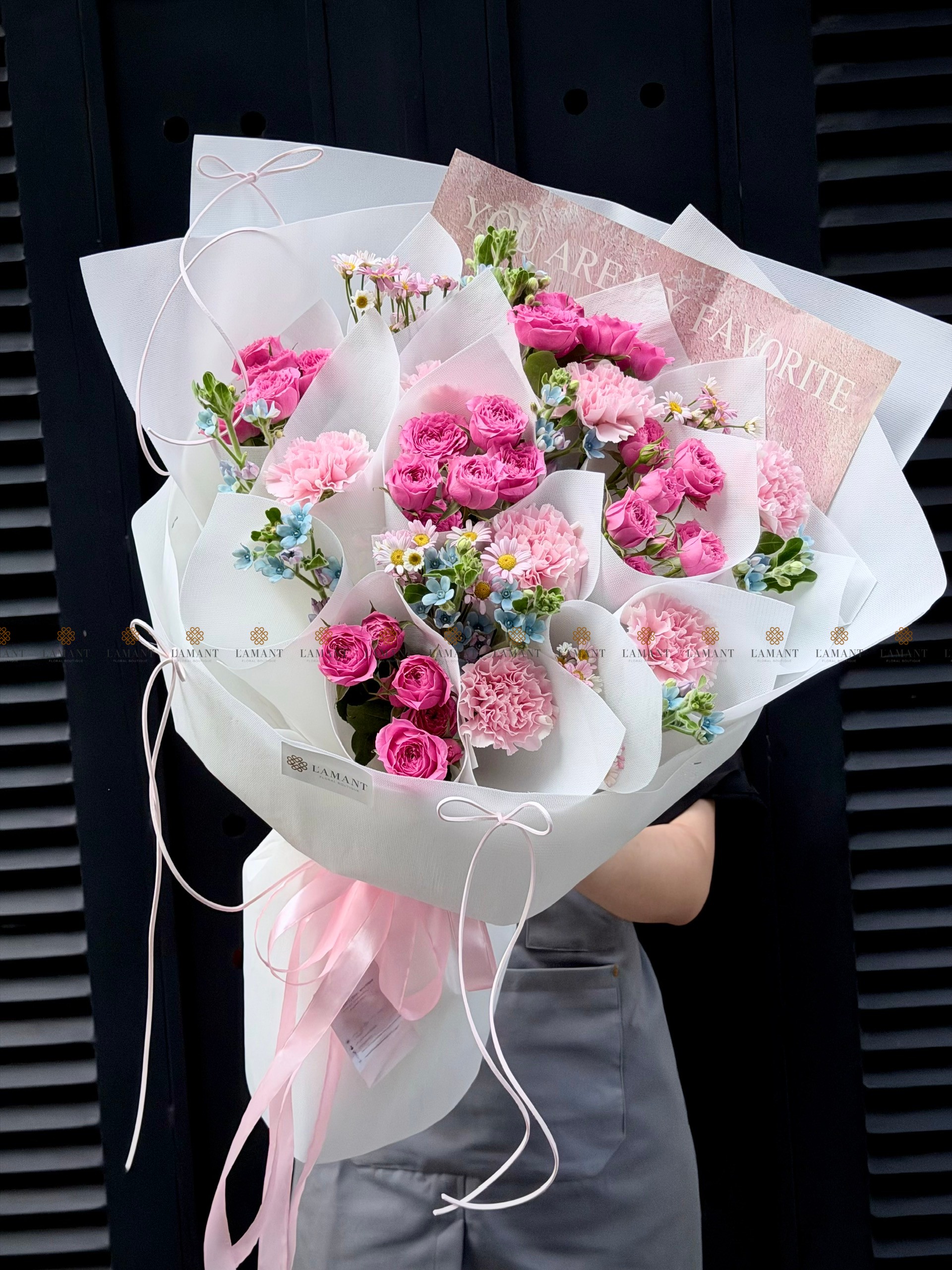 Hoa chính: Hồng chùm sophia, Cúc họa mi, ngôi sao xanh, Phăng hồng nhạt