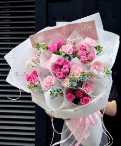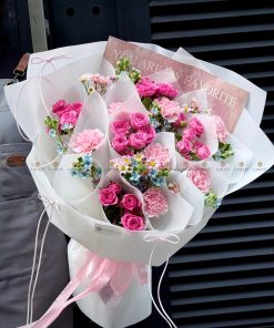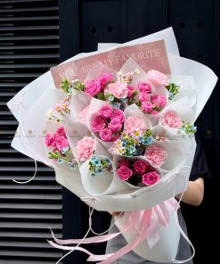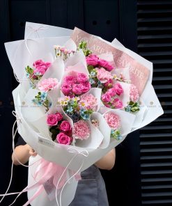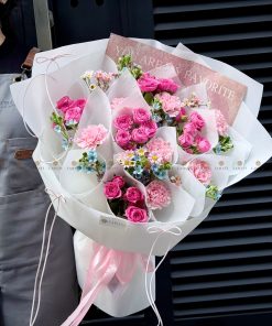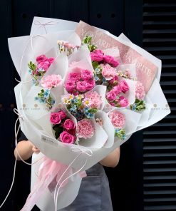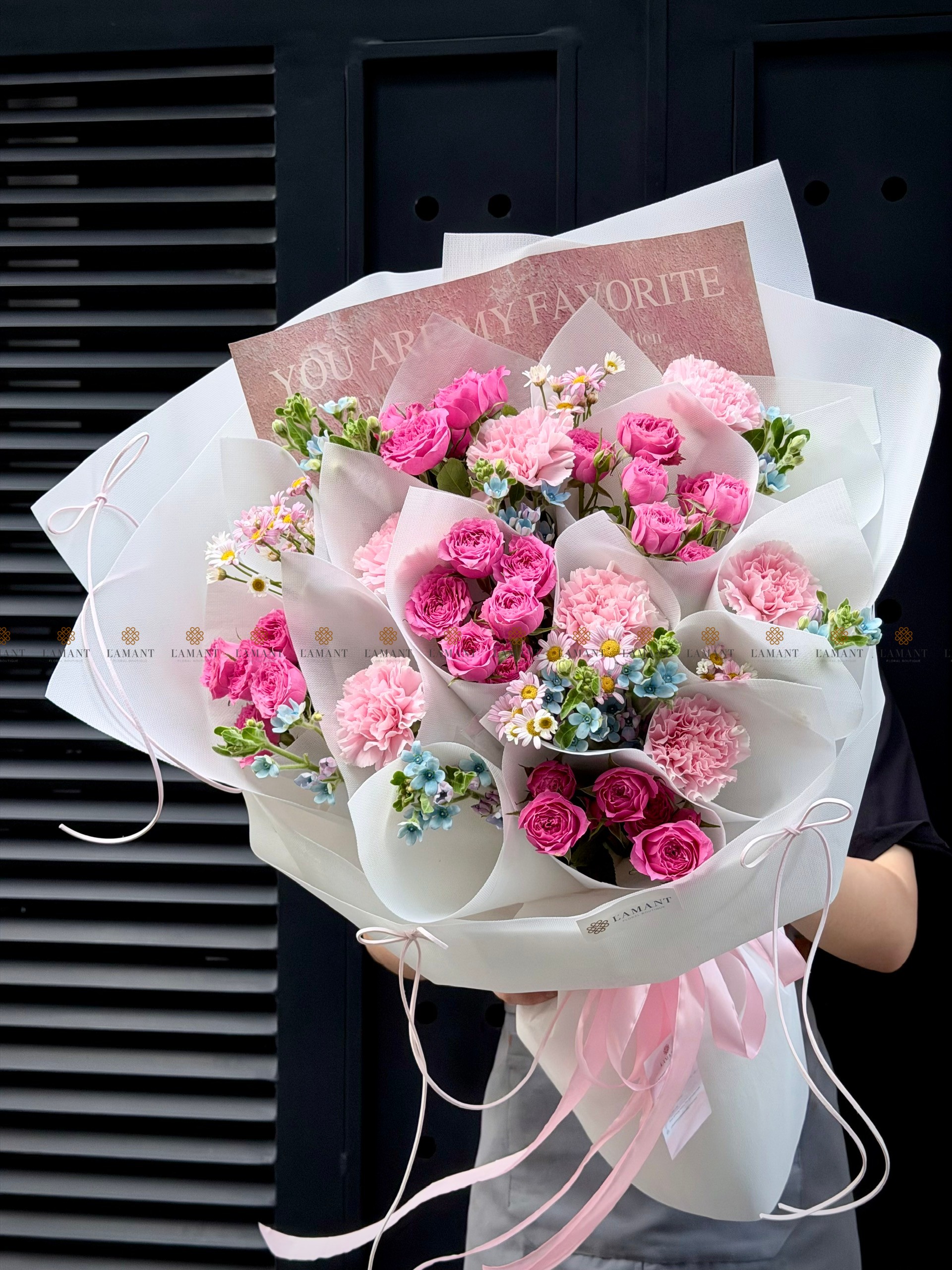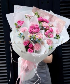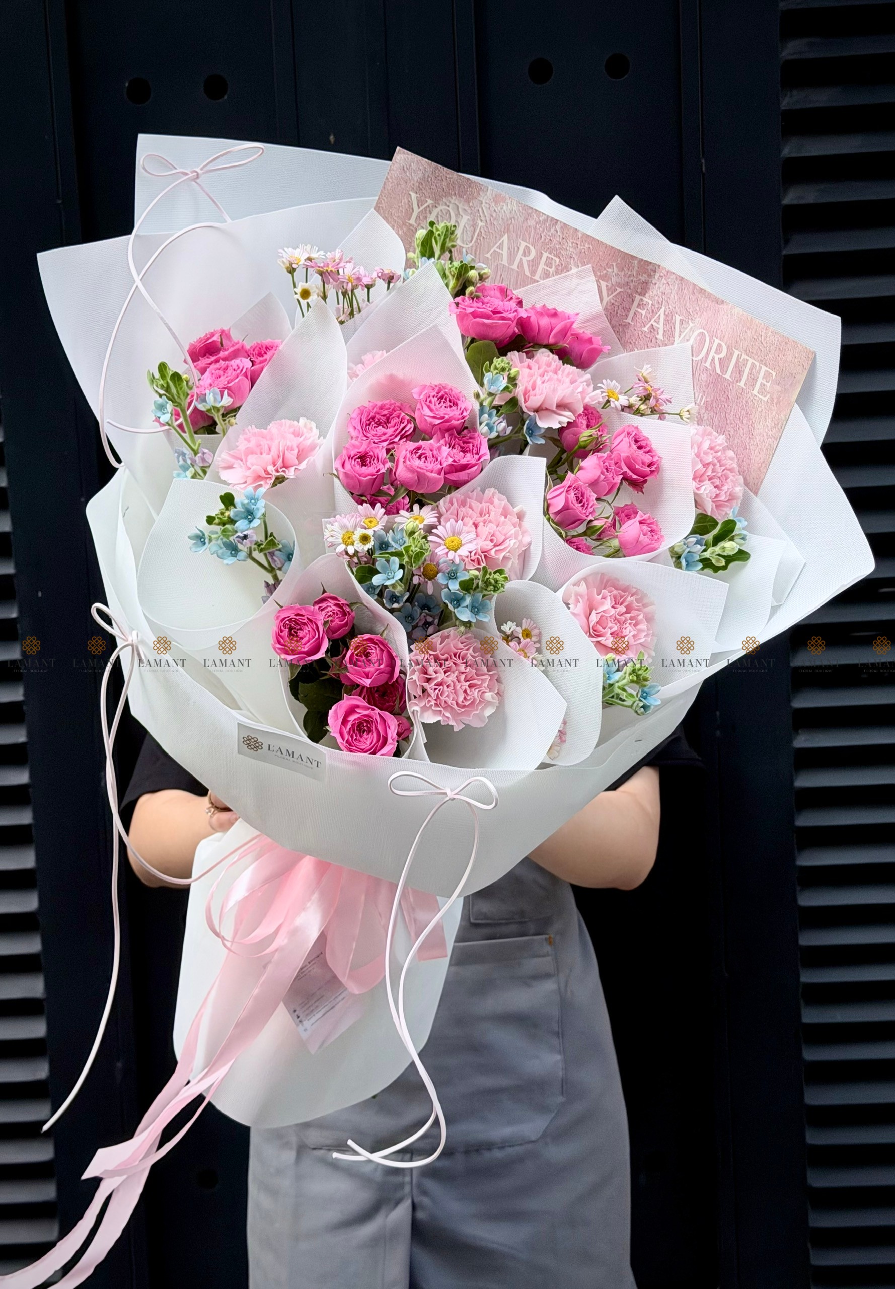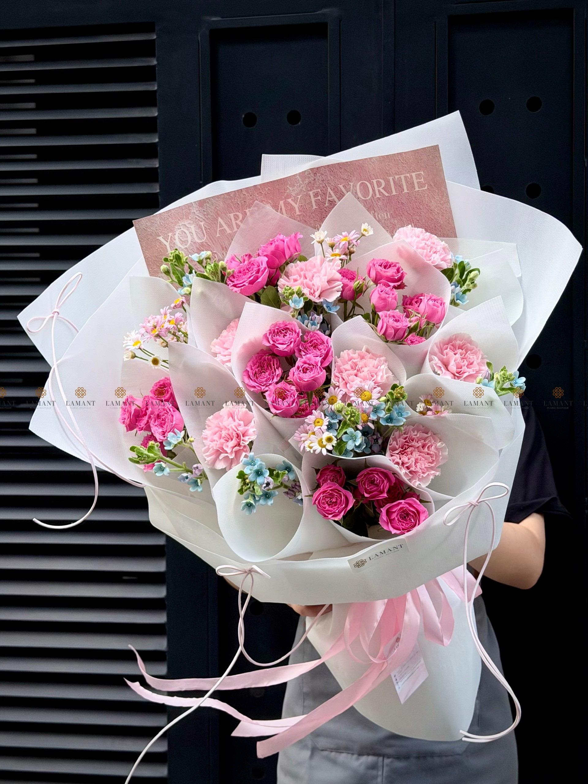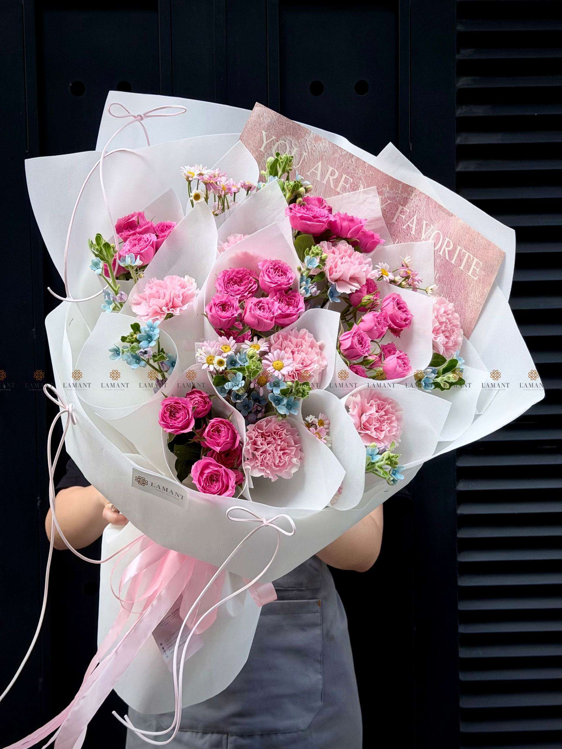 Hoa chính: Hồng chùm sophia, Cúc họa mi, ngôi sao xanh, Phăng hồng nhạt