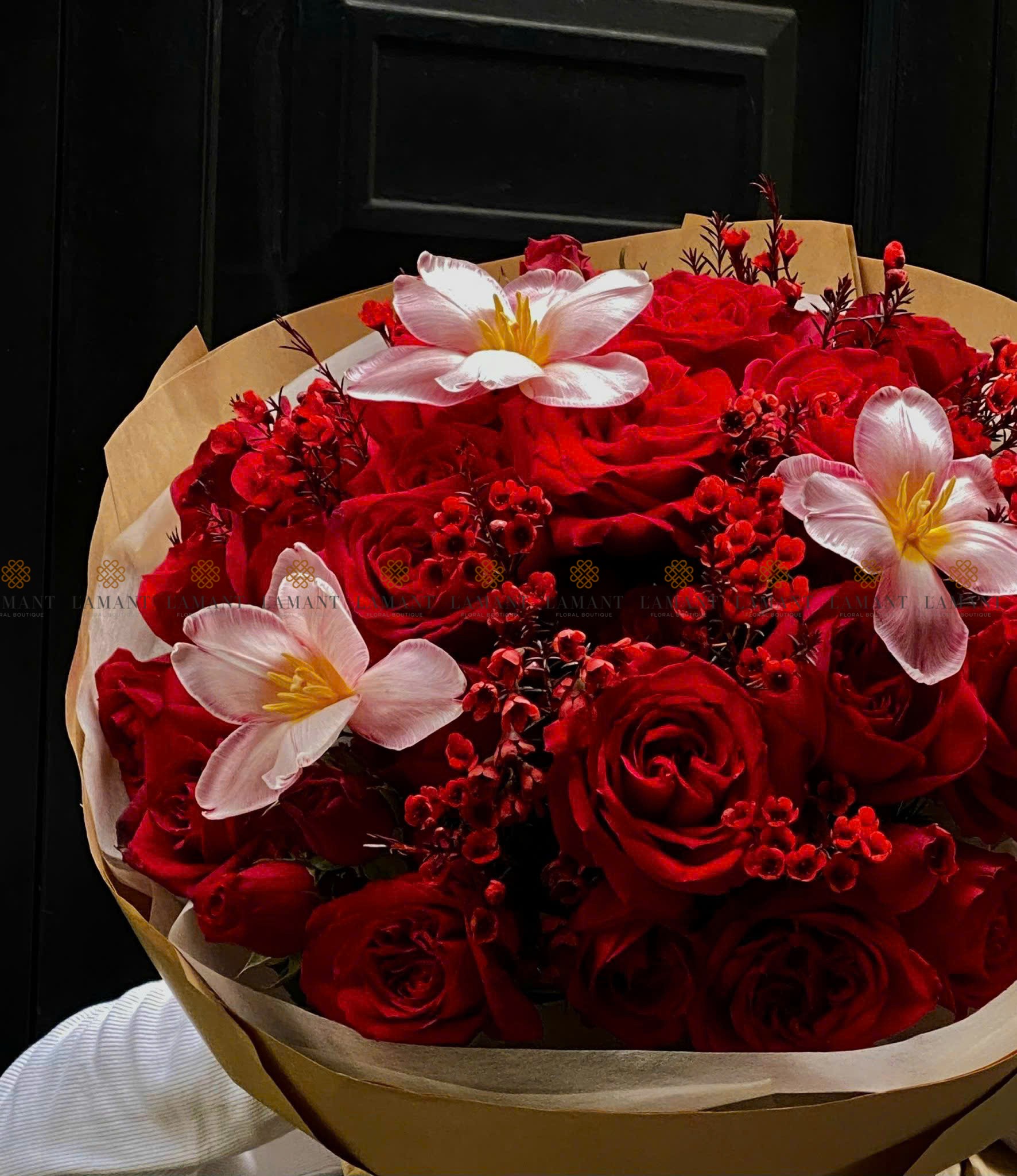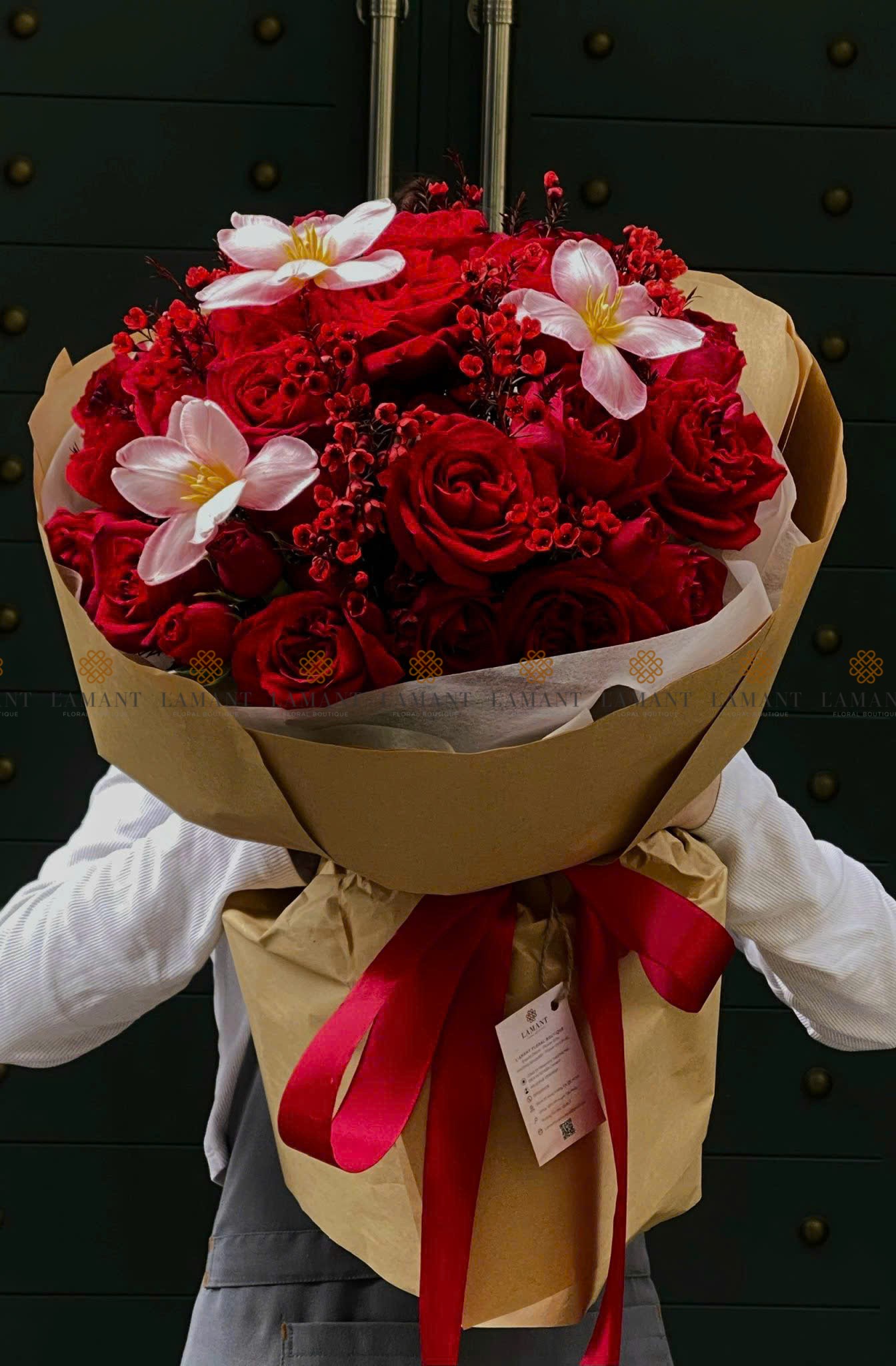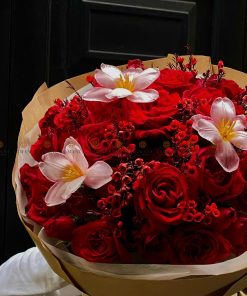 Bó hoa hồng ohara đỏ mix tulip A0135