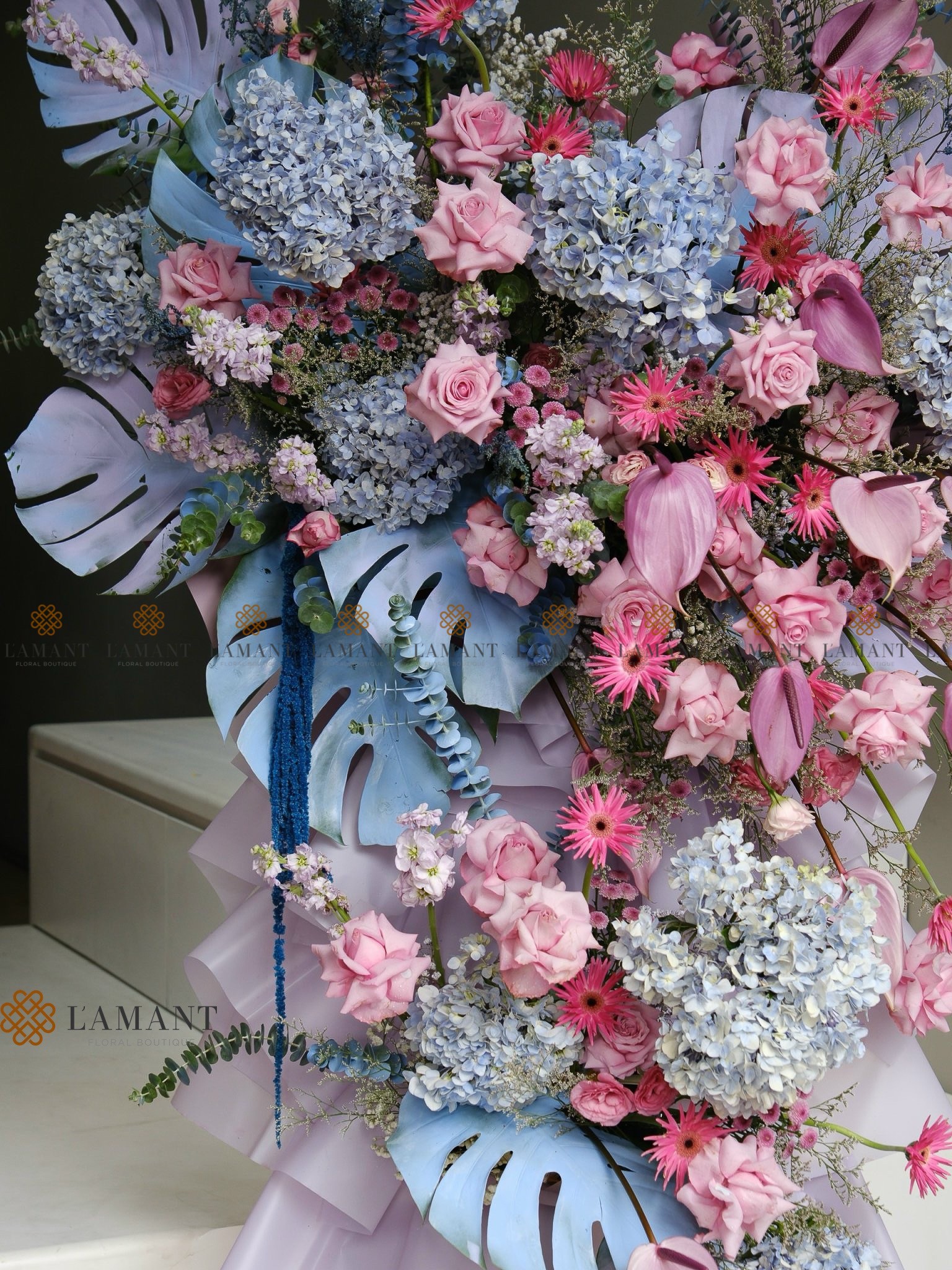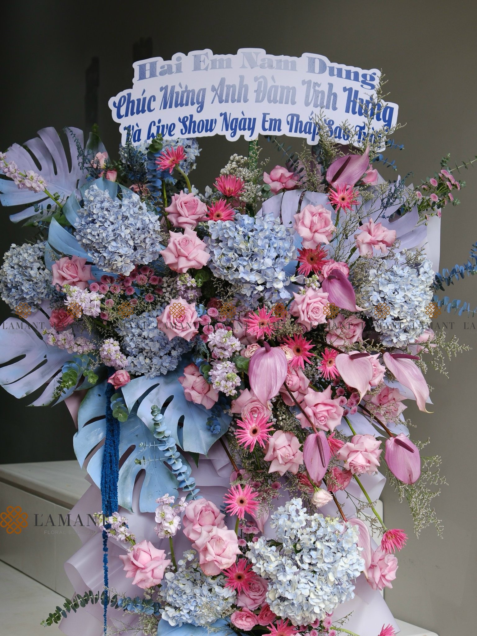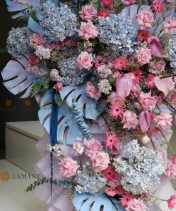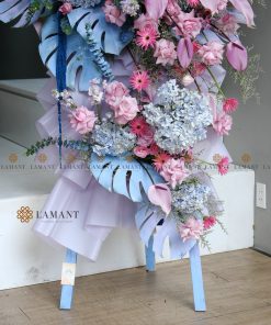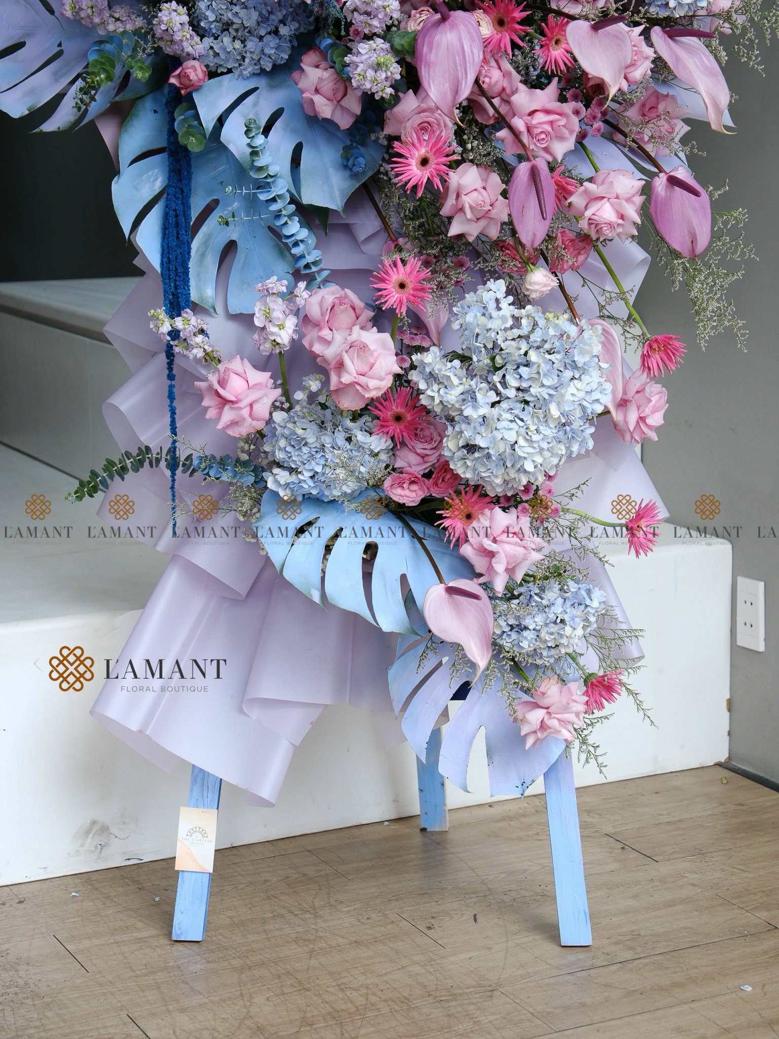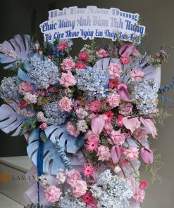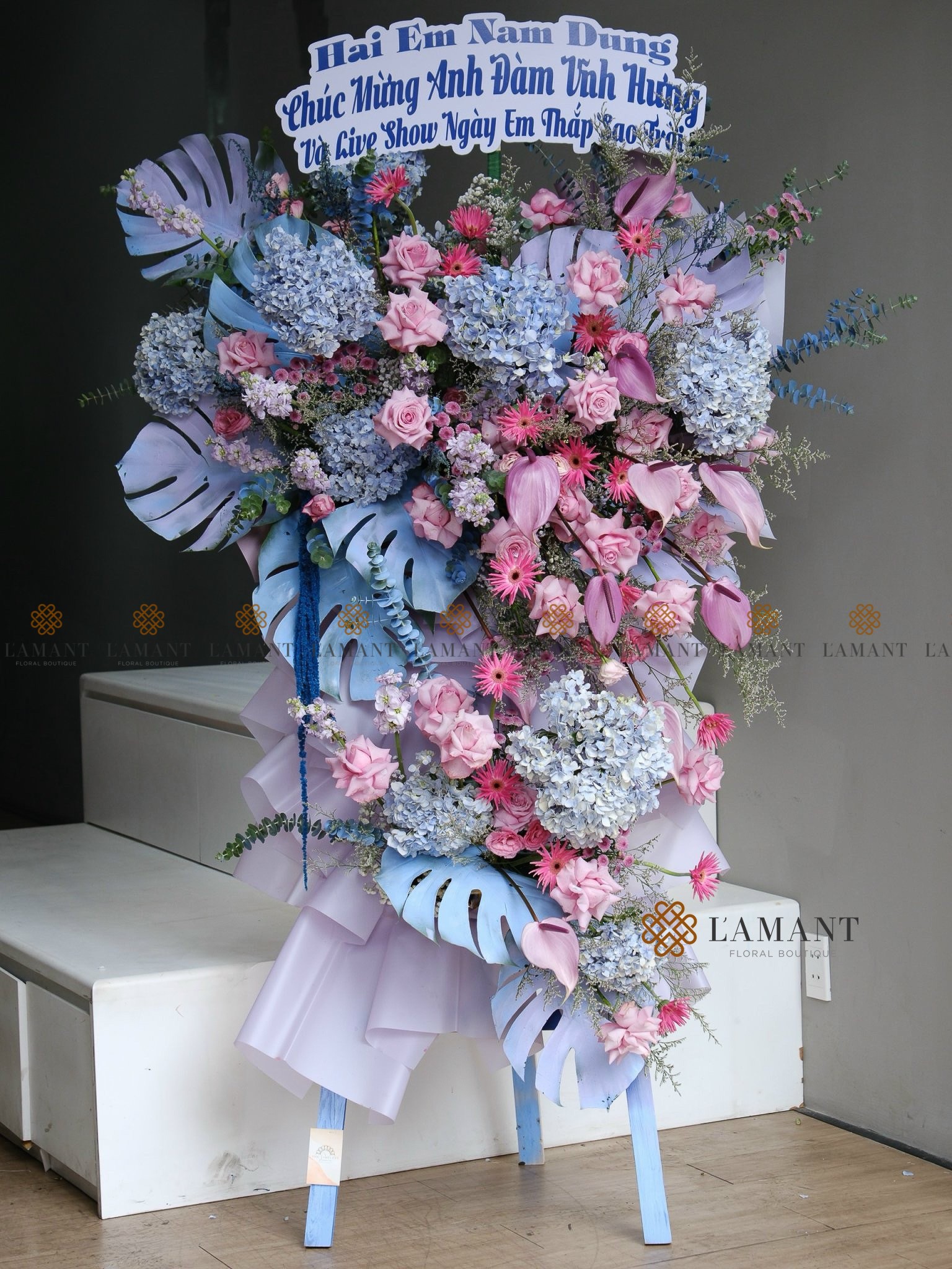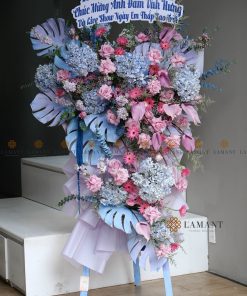 KỆ HOA CHÚC MỪNG MÀU TÍM – XANH DƯƠNG 2m K0001