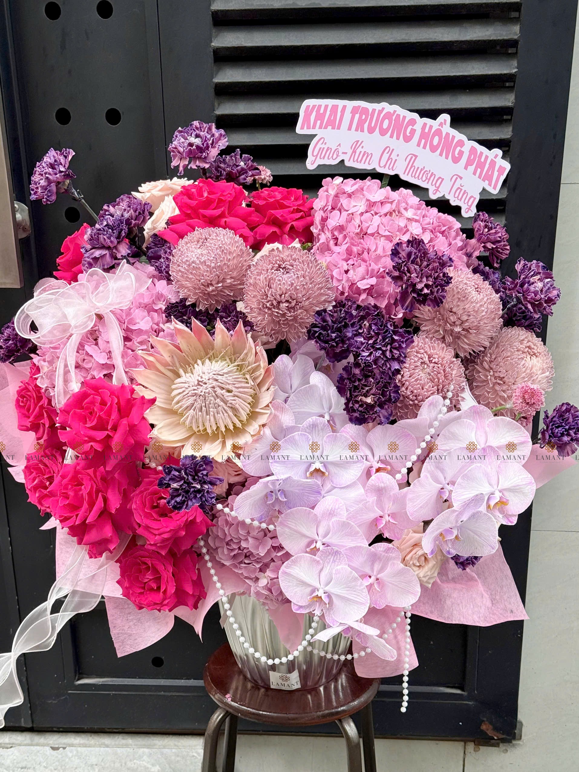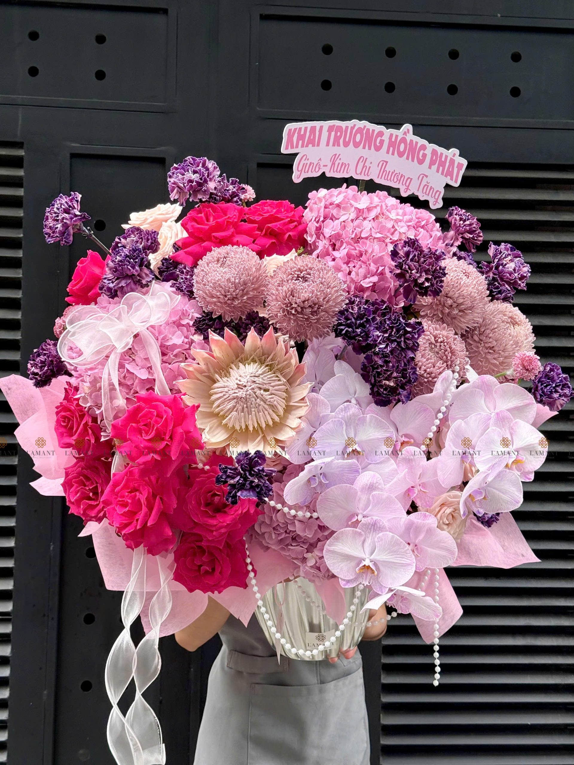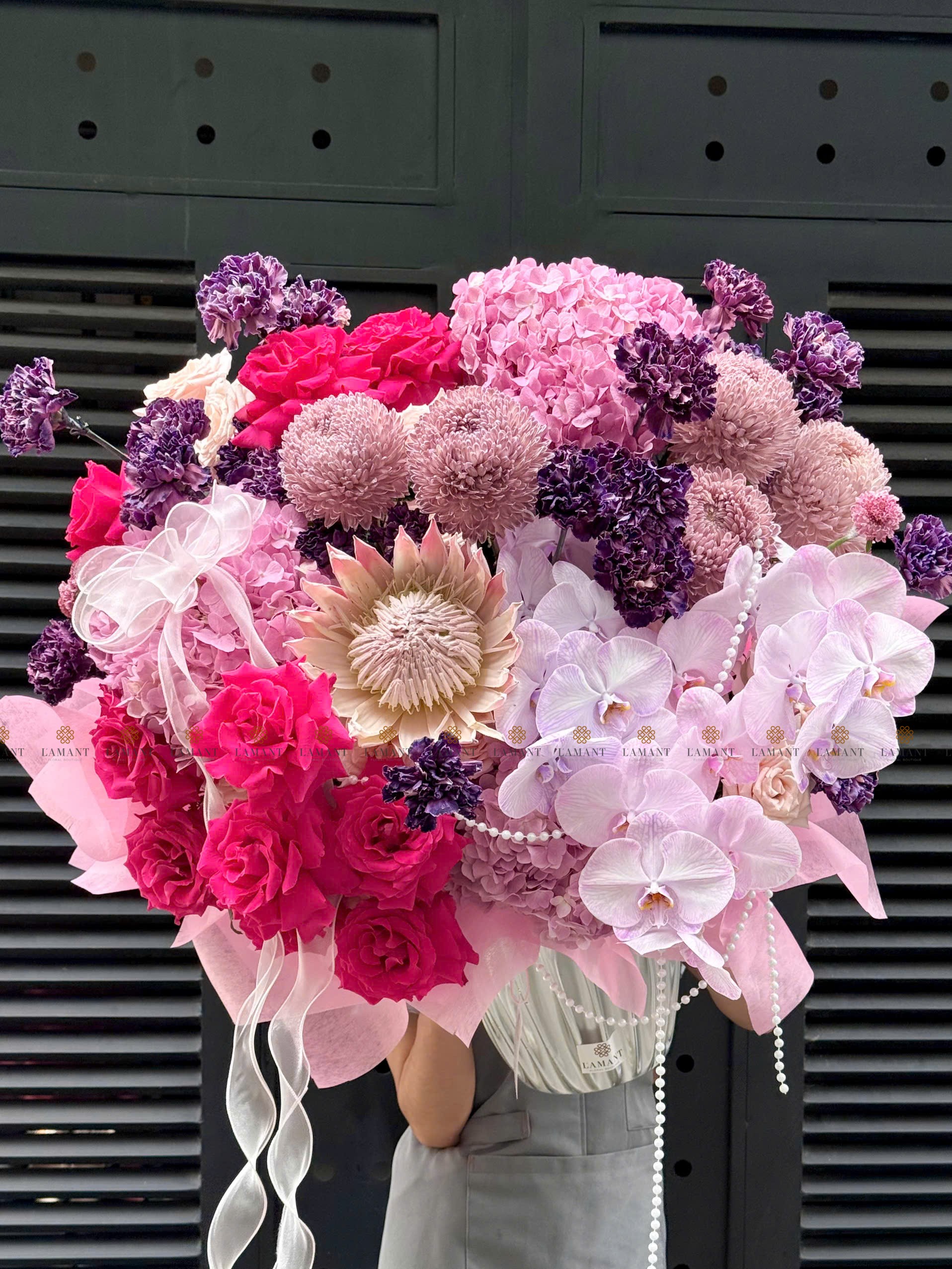 Hoa chính: Hồng nhập ecuador, Thảo đường hoàng đế, cúc mẫu đơn malaysia, Cẩm chướng colombia, Lan hồ điệp, Tú cầu